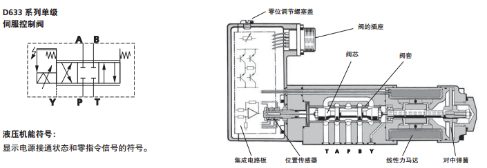 系列屬于直動式伺服控制閥,可應(yīng)用于三通、四通和2*2通的節(jié)流型流量控制閥。適用于電液位置、速度、壓力或力控制系統(tǒng)以及其他需要高動態(tài)響應(yīng)的系統(tǒng)。D633系列伺服閥無需先導(dǎo)油源,通過具有高驅(qū)動力的永磁式線性力馬達(dá)直接驅(qū)動,具有電氣零位調(diào)節(jié)功能,當(dāng)斷電或電纜損壞或緊急停車時,閥芯會無需使用外力自動返回到其彈簧對中位置。