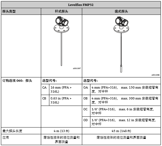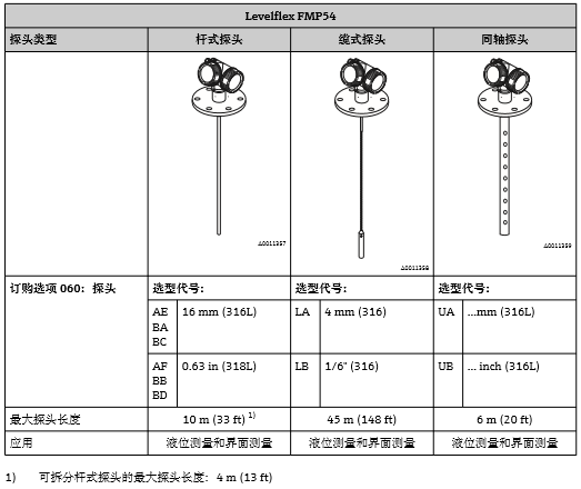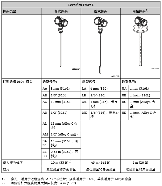 通常,使用桿式探頭或同軸探頭進(jìn)行液位測量。纜式探頭用于量程超過10 m (33 ft)時(shí)的液位測 量(FMP52:量程超過4 m (13 ft)), 以及罐(倉)頂間隙不允許安裝桿式探頭的測量條件下的液位測量。
